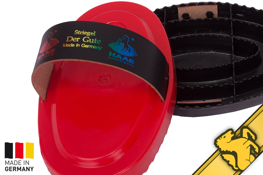 The Haas Curry Comb Der Gute is the classic German curry. reinvented in a gentler. modern version. It is firm enough to remove even caked-on dirt or clean your horse brushes while you groom. The rounded edges do not scratch your horse and superior materials do not crack or split.